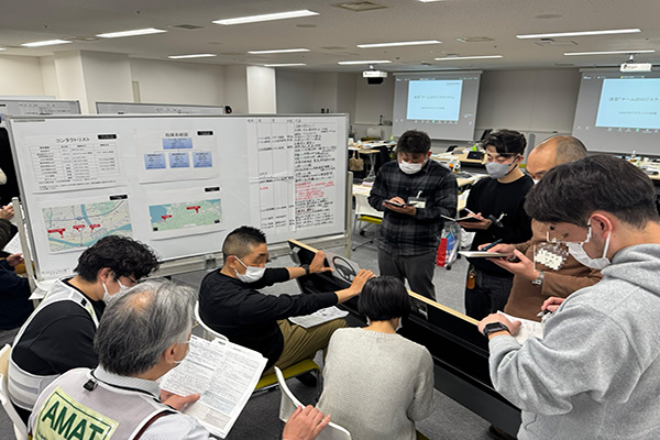研修の構成は、全日病の災害派遣医療チームの構成におけるロジスティックスのポジションや役割がよく分かる講演の後、4〜5名に分かれての班としての演習があります。そこにも講師の先生方がファシリテーターとなって、演習の取得をご指導、ご支援してくださいます。